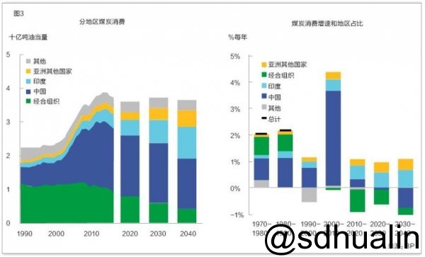 BP認為,煤炭消費在展望期間大體平緩,2040年煤炭在一次能源中的比例下降至21%,達到自工業(yè)革命以來的最低值。盡管中國煤炭消費見頂,中國依然是世界上最大的煤炭市場,到2040年占全球煤炭需求的40%。中國和經(jīng)合組織消費量減少的部分,將被印度及其他新興亞洲經(jīng)濟體的需求增加所抵消。印度是煤炭最大的增長市場,在全球煤炭需求中的占比將從2016年的略高于10%翻倍至2040年的25%左右。(見圖3)