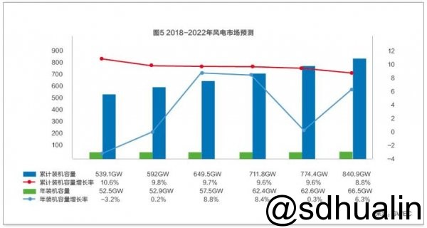 而根據(jù)GWEC《2017年全球風電發(fā)展報告》對2018-2022年全球風電市場的預測,2018年全球風電市場將基本保持在2017年的水平,2019年和2020年全球風電市場恢復增長,21世紀20年代初將再次突破60吉瓦;到2022年底,累計風電裝機容量總量將達到840吉瓦。(見圖5)